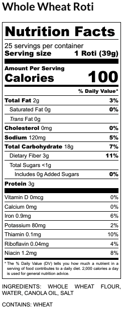 Made using just 3 simple ingredients: 100% whole wheat atta, canola oil and salt.